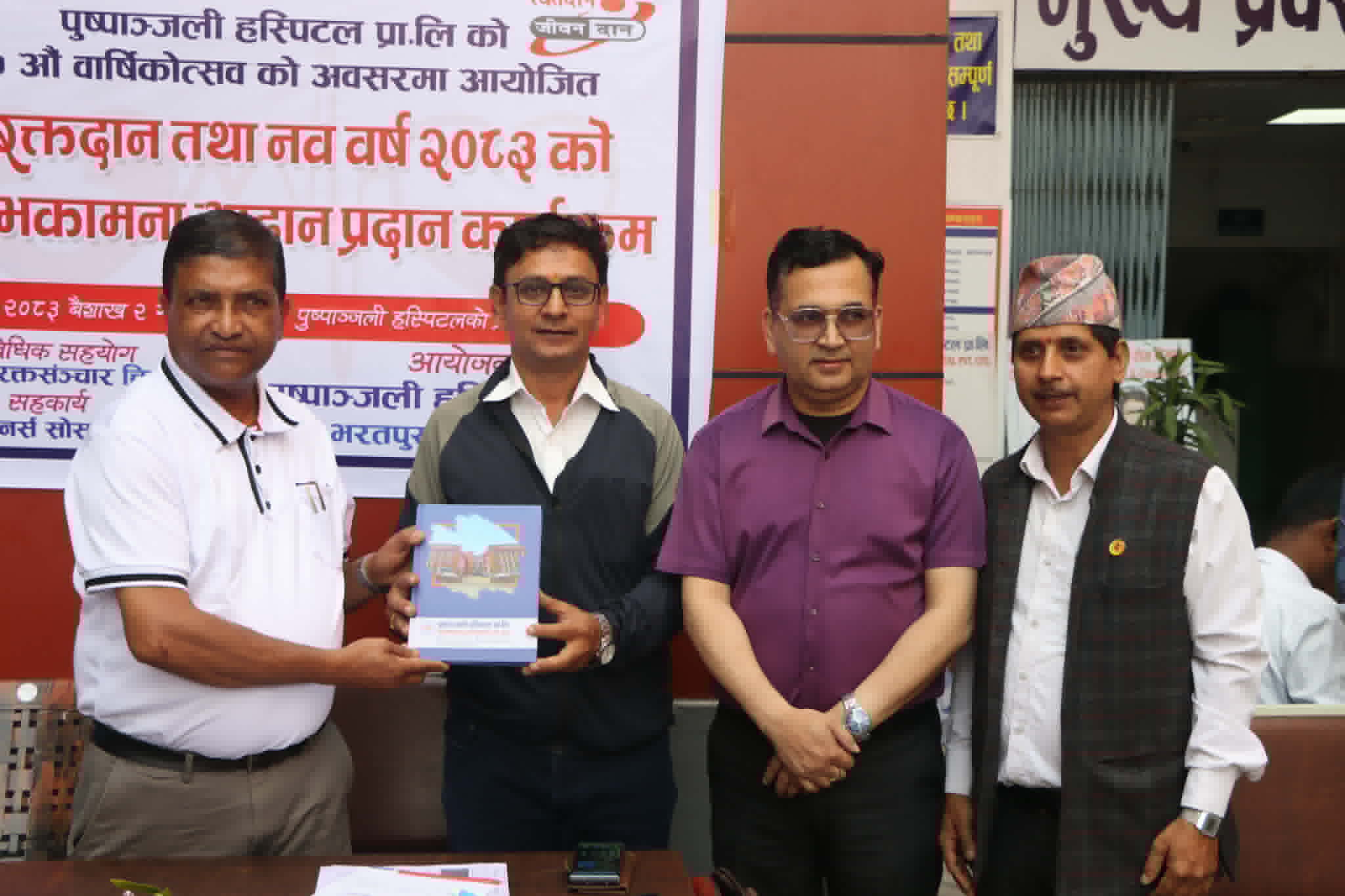 चितवन । भरतपुर महानगरपालिका वडा नम्बर १० स्थित बालमन्दिर रोडमा रहेको श्री पुष्पाञ्जली अस्पतालको १७ औं वार्षिकोत्सवका अवसरमा ५७ जनाले रक्त दान गरेका